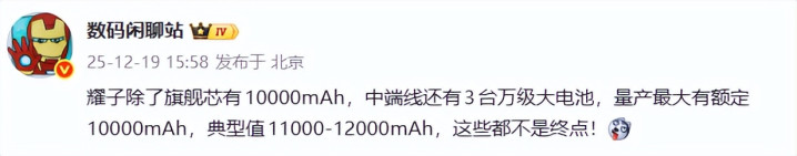 因为据最新爆料,荣耀在中端线上还藏了一手:电池典型容量最高做到12000mAh。