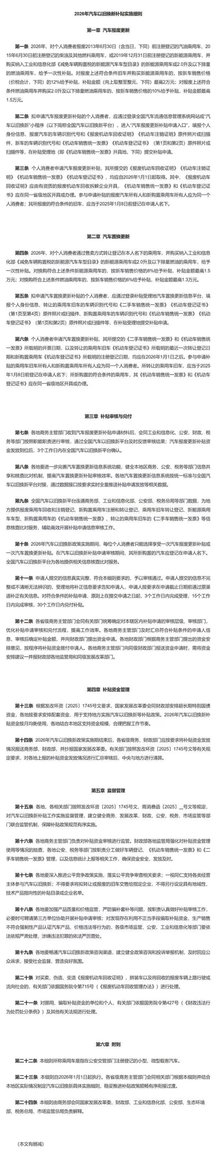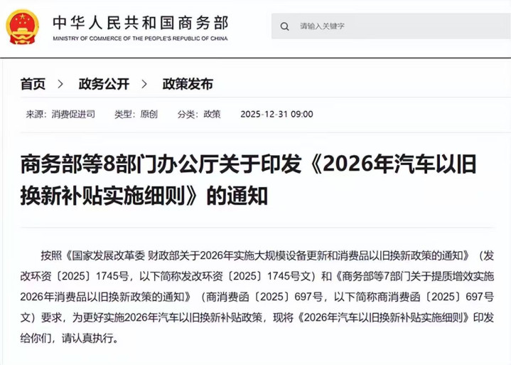 “年底刚盘算着换新车,就刷到了补贴新政,可我家旧车是2025年3月买的,还能享优惠吗?”12月31日一早,市民张先生的朋友圈就被汽车以旧换新补贴的消息刷屏,心里犯起了嘀咕。当天,商务部等8部门联合发布《2026年汽车以旧换新补贴实施细则》,明确2026年内个人报废或置换符合条件的旧车购买新车,最高可享2万元补贴,而旧车需在2025年1月8日前登记在本人名下这一关键条件,让不少像张先生这样的潜在换车族格外关注。